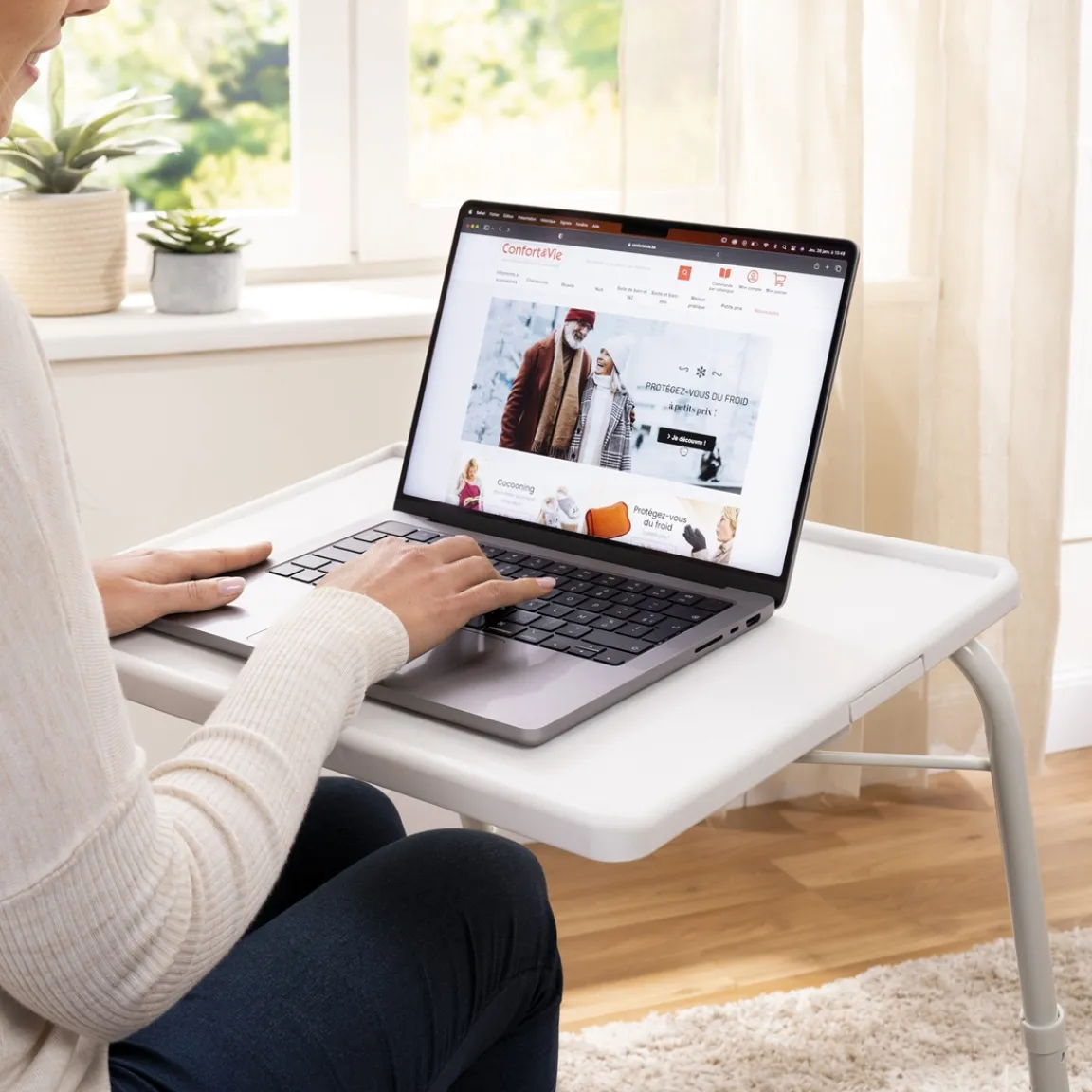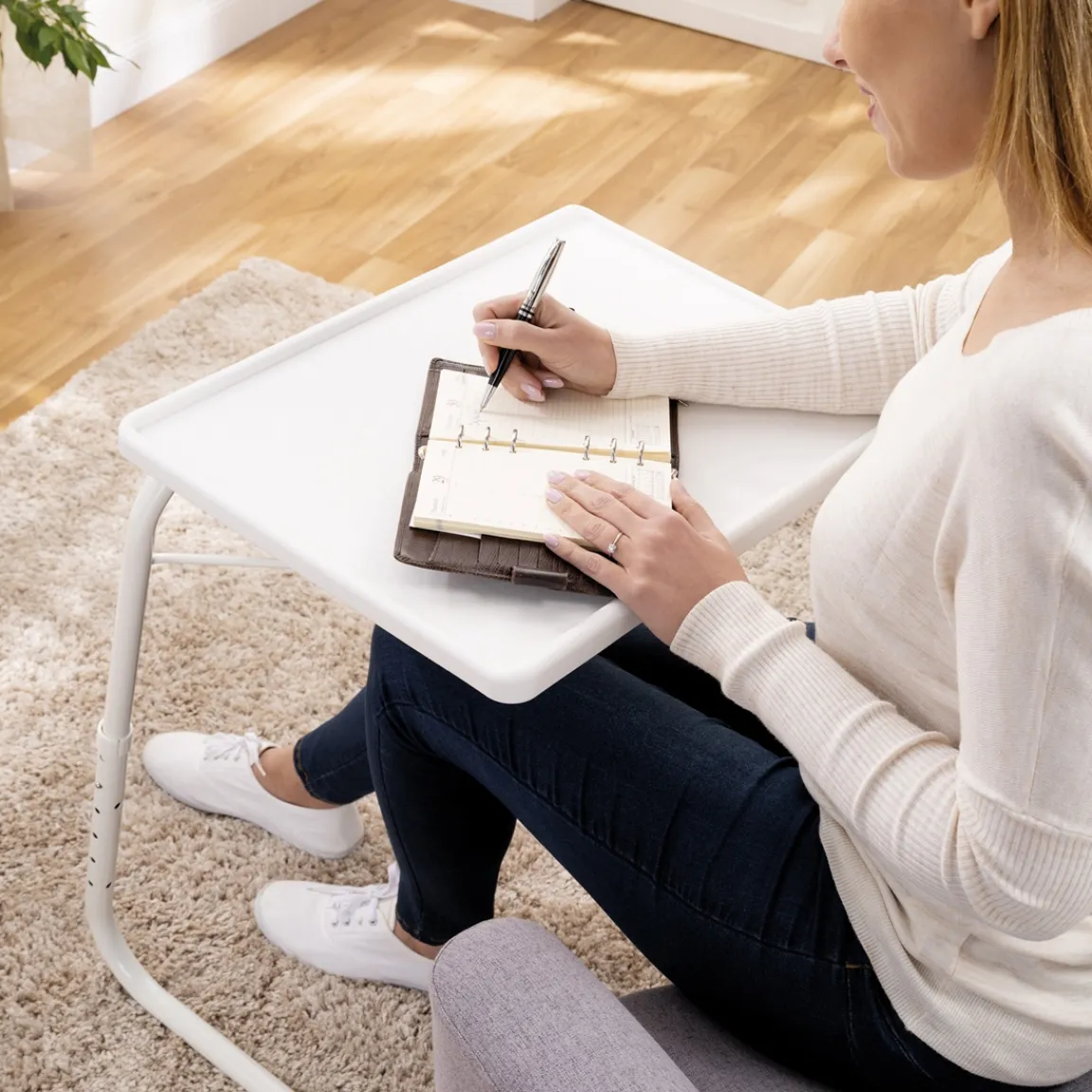 Cette petite table d’appoint va vous permettre d’être confortablement installé pour regarder la TV, prendre votre repas ou faire vos mots croisés. Réalisée en métal et plastique, elle est bien stable et ses pieds se glissent sous le fauteuil ou le canapé. Elle se plie facilement et se range sous un meuble. Tablette réglable en inclinaison et hauteur (de 51 à 63 cm env.). En matière plastique et métal. Dimensions tablette : 52,5 x 40 cm env.