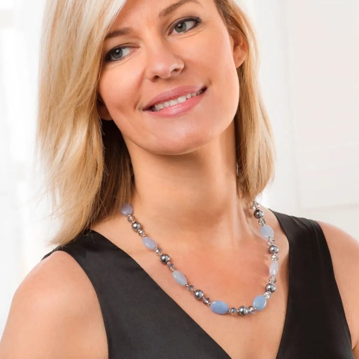 Voici un bijou plein de fantaisie pour réveiller vos tenues du moment. Ce collier est travaillé dans un registre pastel empreint de douceur mixant le gris et le bleu. Il conjugue perles de verres ovales mates, perles rondes nacrées grises, micro-perles argentées et perles à facettes transparentes.