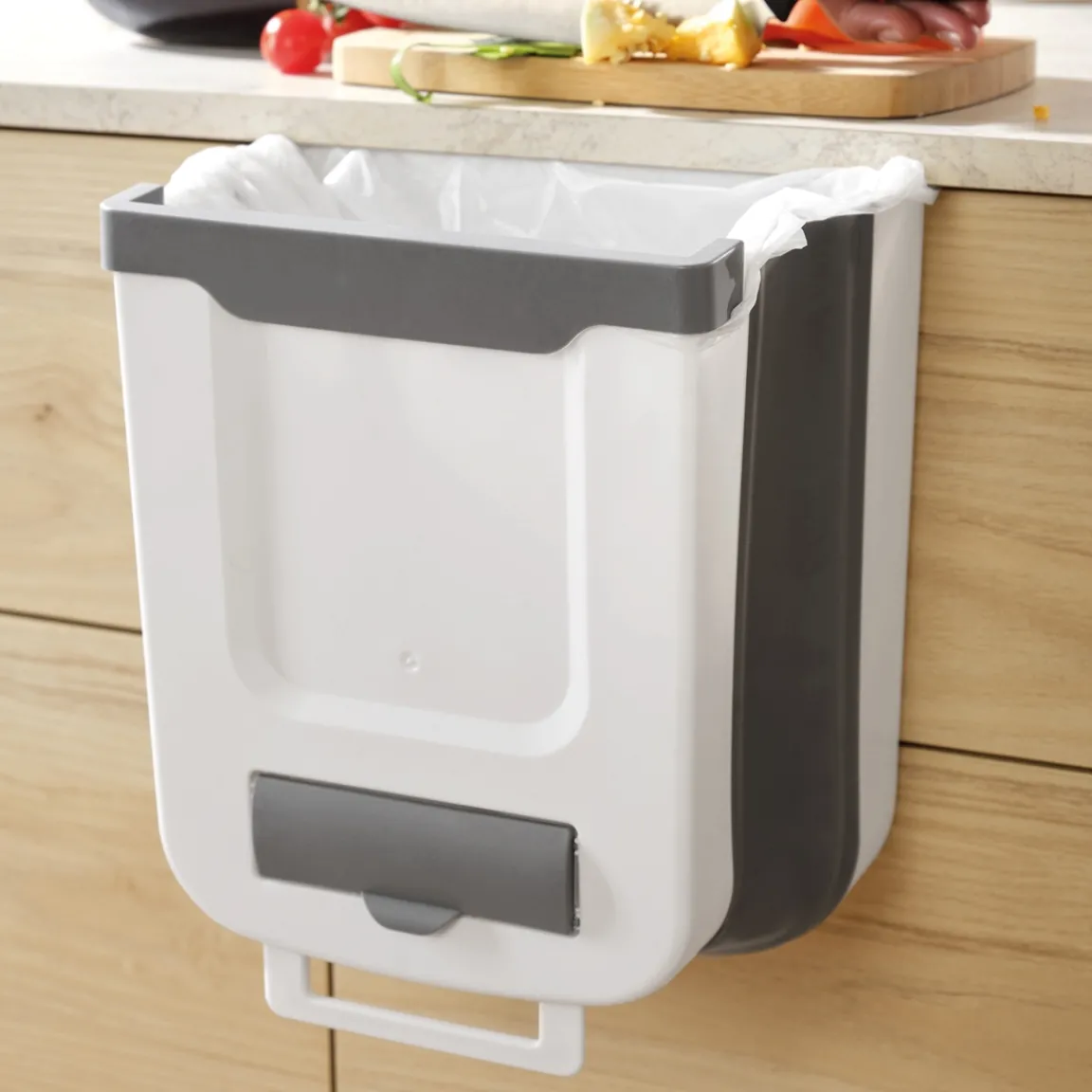 Pratique lors de vos préparations culinaires, cette poubelle suspendue à une porte de placard, est toujours prête à recueillir les épluchures de légumes, les emballages ou les coquilles d’œufs…