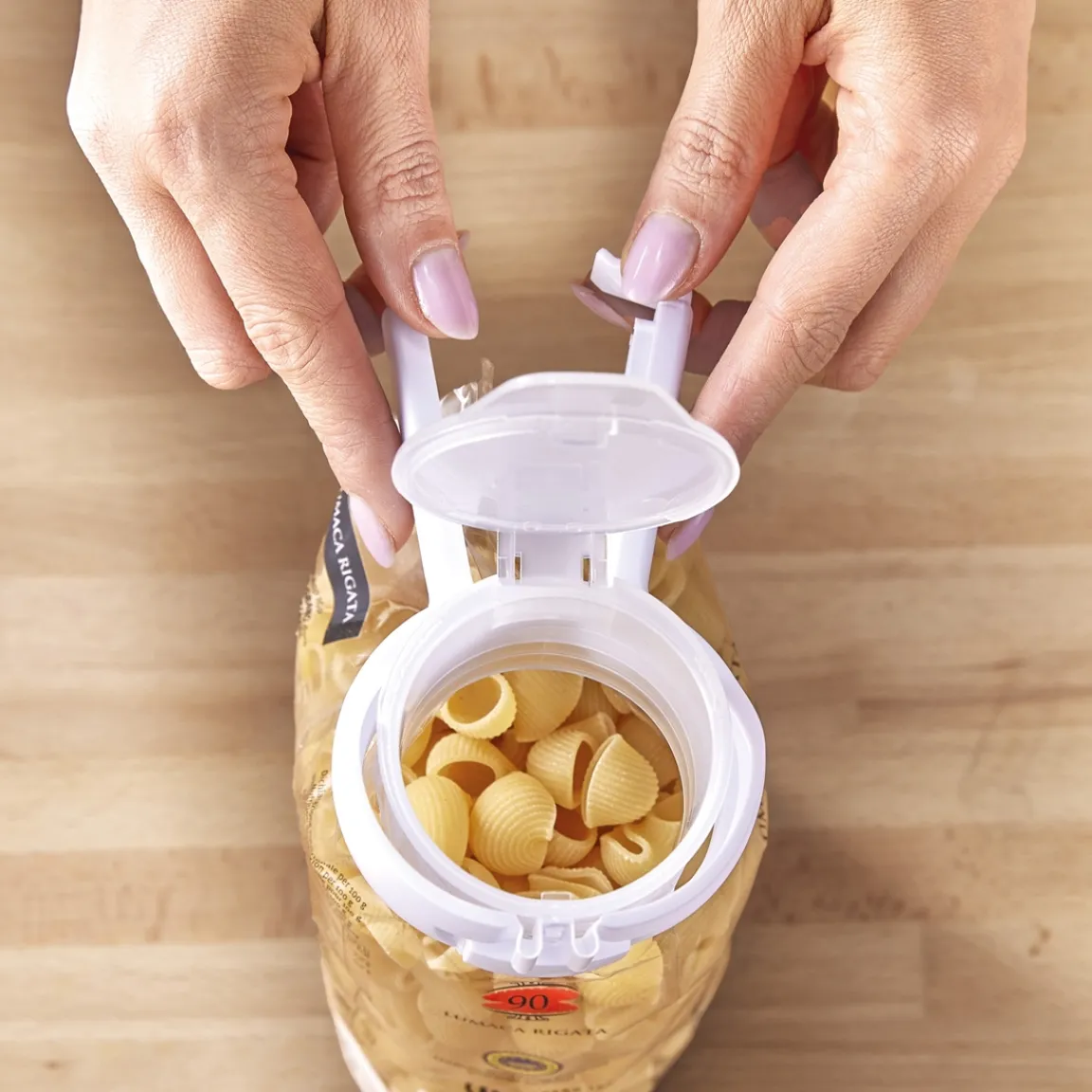 Ces pinces permettent de mieux servir et de préserver les denrées de vos sachets entamés. Coincez le sachet (pates, céréales, croquettes, biscuits…) dans la partie inférieure de la pince. Pour le service, il suffira d’ouvrir le bouchon ! Lot de 2 pinces bouchon verseur : optimisez le rangement et le service de vos denrées alimentaires !