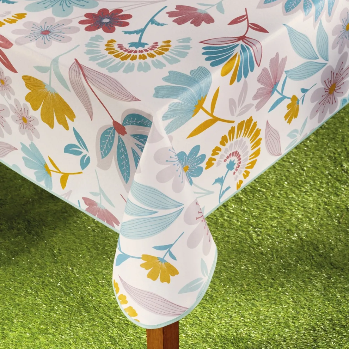 Cette nappe invite joie et bonne humeur au menu de votre tablée ! Légère et souple, elle est facile à entretenir, elle passe en machine et ne se froisse pas. Fini le repassage ! Avec un très beau décor fleuri, la nappe est délicatement achevée d’un biais bleu turquoise.