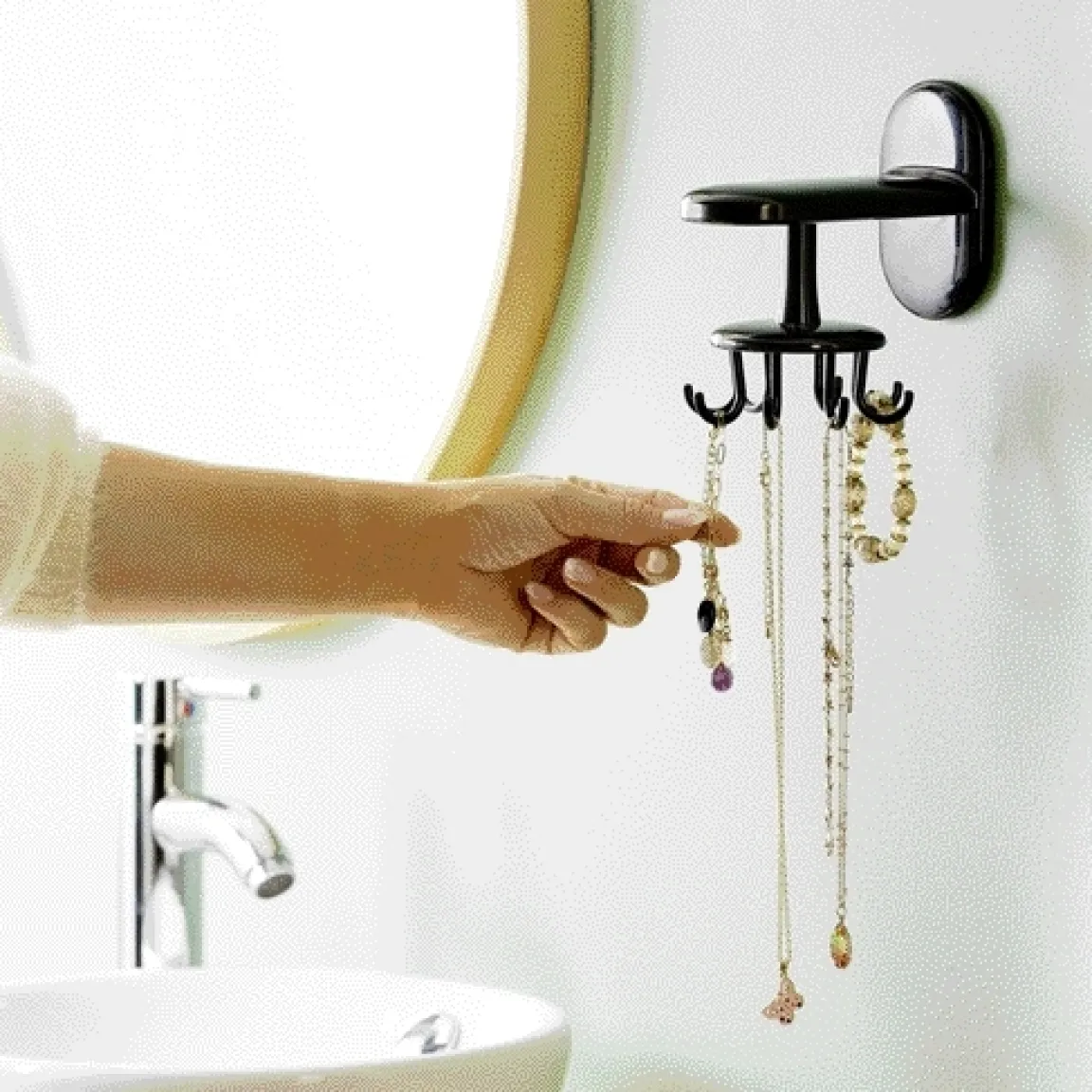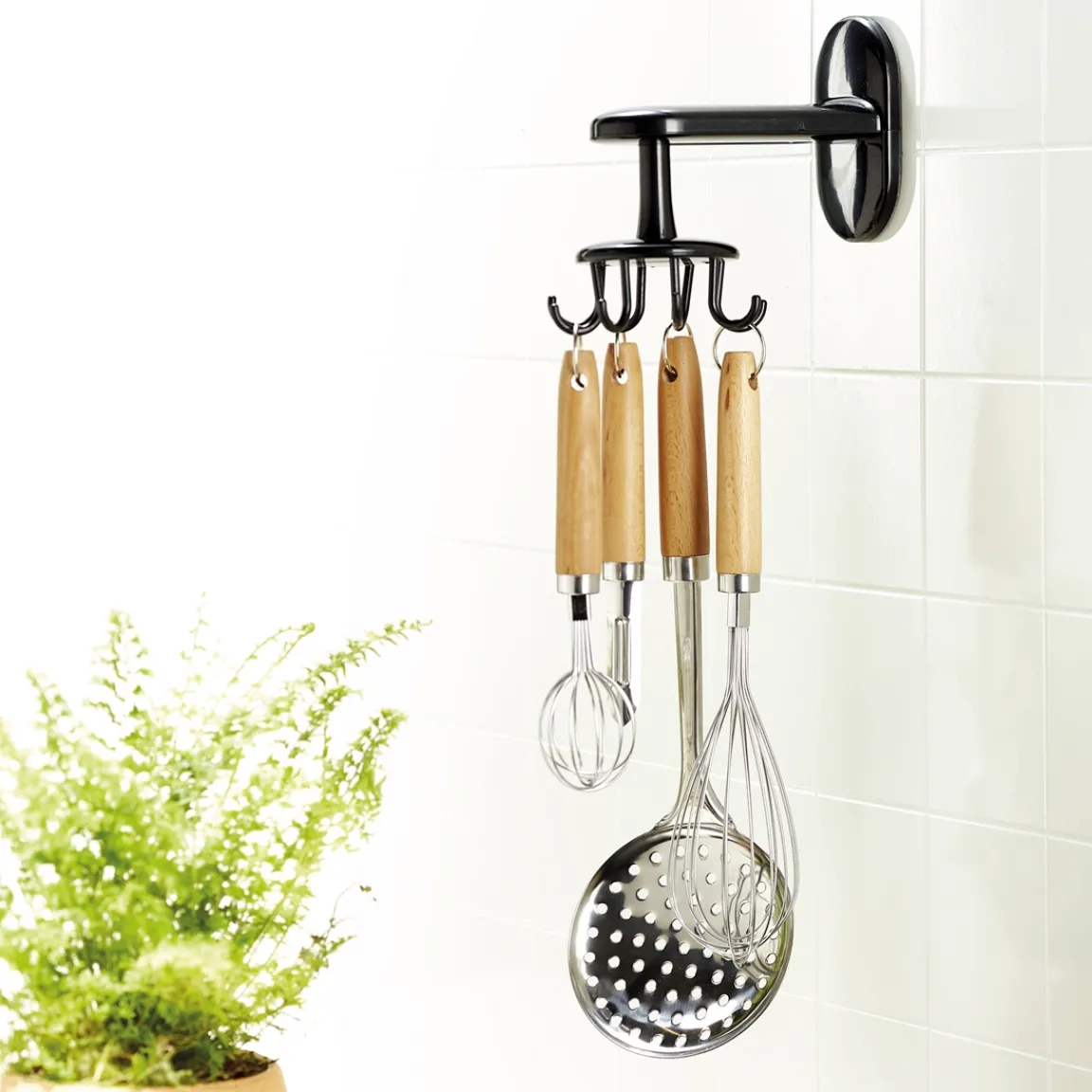 Un support que l’on suspendrait sur un mur grâce à une pastille adhésive, qui se chargerait d’accueillir vos ustensiles : louches, spatules, fouets… en voici une belle idée ! Il est équipé de plusieurs crochets pour y suspendre plusieurs accessoires et tourne sur lui-même.