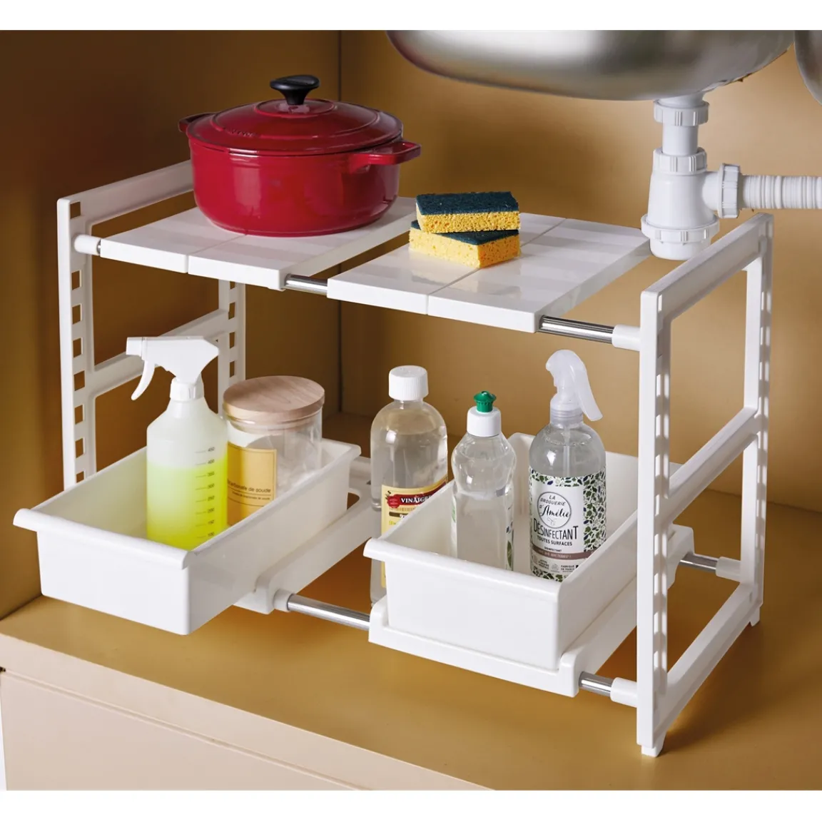 Avec les tuyaux d’évacuation, on doit souvent se résigner à n’utiliser que le bas du placard sous évier ! Cette étagère modulable a été conçue pour permettre d’utiliser tout l’espace : il suffit de déclipser en un tour de main, les planches gênantes pour laisser passer les tuyaux et optimiser le rangement.
