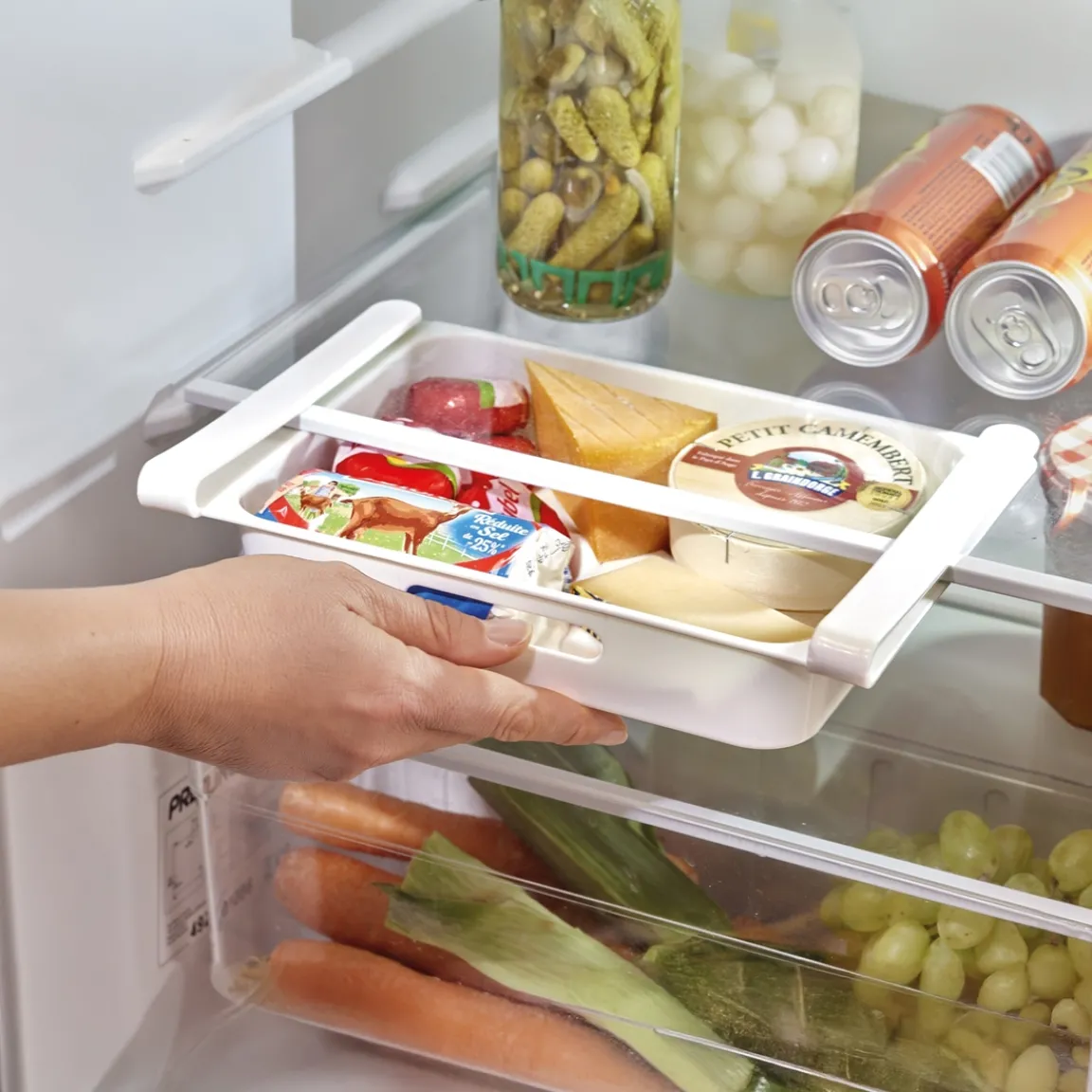Voici une astuce ingénieuse pour gagner de la place dans votre réfrigérateur : ce tiroir spécial réfrigérateur s’installe entre deux étagères grâce à un système coulissant. Il propose une meilleure organisation dans la et un rangement approprié pour certaines denrées comme les oeufs ou les mets délicats.