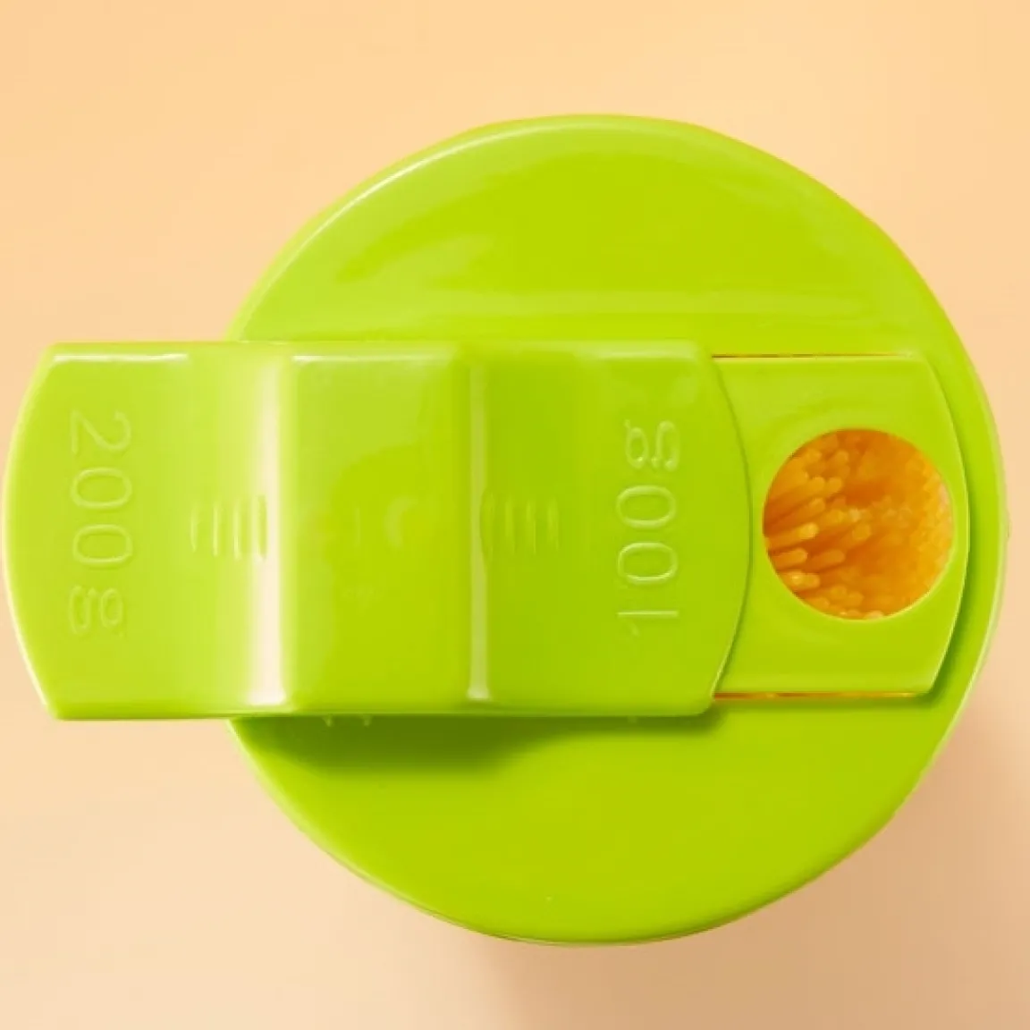 Fini le problème des sachets de spaghettis qui se déchirent transformant votre placard en champ de bataille… grâce à cette boîte, les spaghettis restent bien rangés et en plus, vous pourrez cuire la dose précise dont vous avez besoin. Le couvercle doseur distribue en effet 100 ou 200 g soit 1 ou 2 portions.