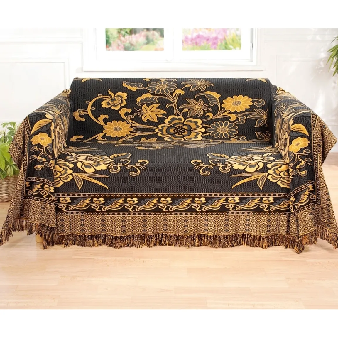 Pour protéger ou rénover votre canapé, ne cherchez plus ! Avec son somptueux motif jacquard floral encadré, ce jeté apportera à votre intérieur une note de décoration chaleureuse et raffinée. Fleurs coloris or sur fond noir ou l’inverse ? À vous de choisir… ou de changer de décor en un clin d’œil ! Finition frangée sur 2 côtés. En 60% coton, 40% polyester, lavable en machine. Dim. 200 x 240 cm env.