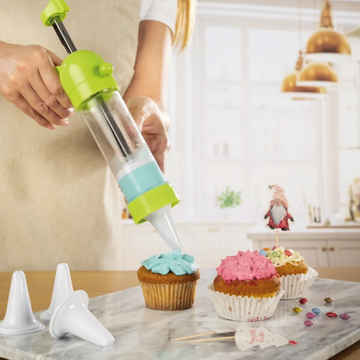 Ce kit à biscuits se compose d’un piston à pression, de 6 douilles et de 13 disques de décoration amovibles, afin de vous offrir de multiples possibilités et une précision inégalée, dans la réalisation de toutes vos préparations sucrées ou salées. Remplissage, fourrage, décoration... tout devient un jeu d’enfant ! Choisissez votre douille, remplissez le piston et réglez le débit avec la molette : c’est aussi simple que cela.