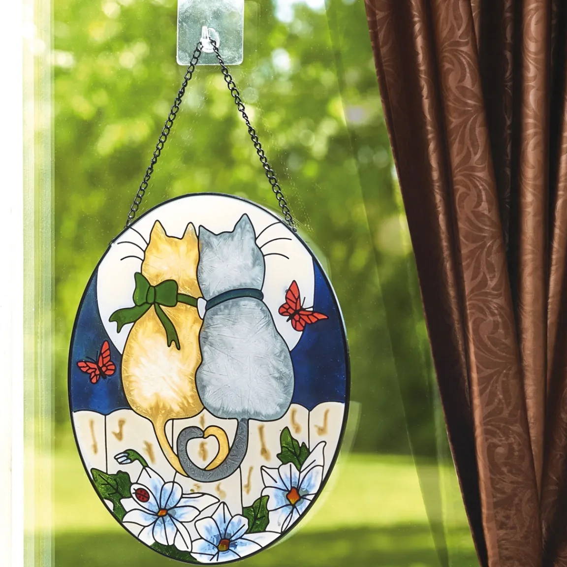 Suspendu à une fenêtre, ce superbe vitrail décoré d’un adorable motif chats, reflétera la lumière et signera votre décoration d’une note romantique et tendre.